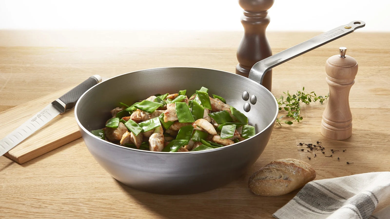 The Mineral B range of de Buyer pans, woks and other utensils are made of sheet steel with a beeswax finish.