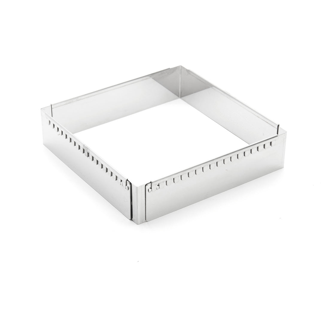 An adjustable pastry square frame measuring 37 x 37cm is a versatile kitchen tool used in baking and pastry making. It features adjustable sides that can be expanded or contracted to fit various pan sizes, ensuring precise dough or pastry shaping. Its durable construction and convenient size make it an essential tool for achieving uniform pastry creations.