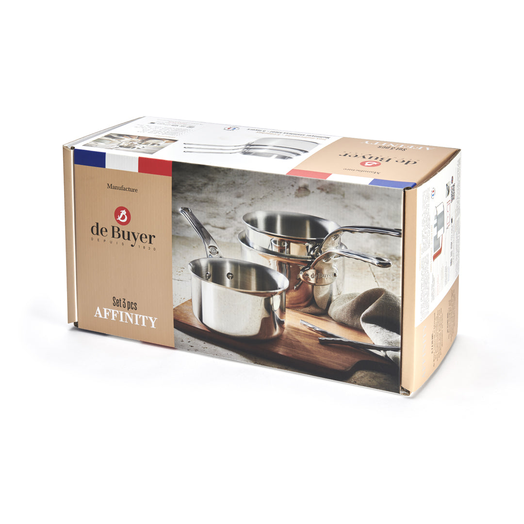 The De Buyer Affinity 3-piece saucepan set is a culinary masterpiece. Crafted with precision and elegance, these saucepans are a chef's dream. Made from high-quality stainless steel, they feature ergonomic handles and a sleek, polished exterior. The set includes a range of sizes to suit all your cooking needs. With even heat distribution and a timeless design, these saucepans are a kitchen essential for both professional chefs and home cooks, offering exceptional performance and style.