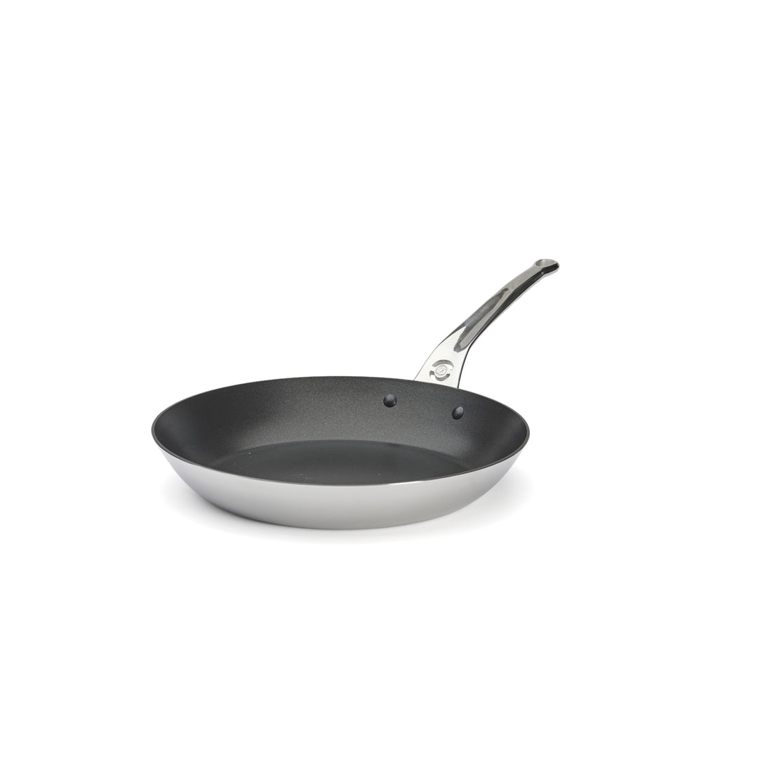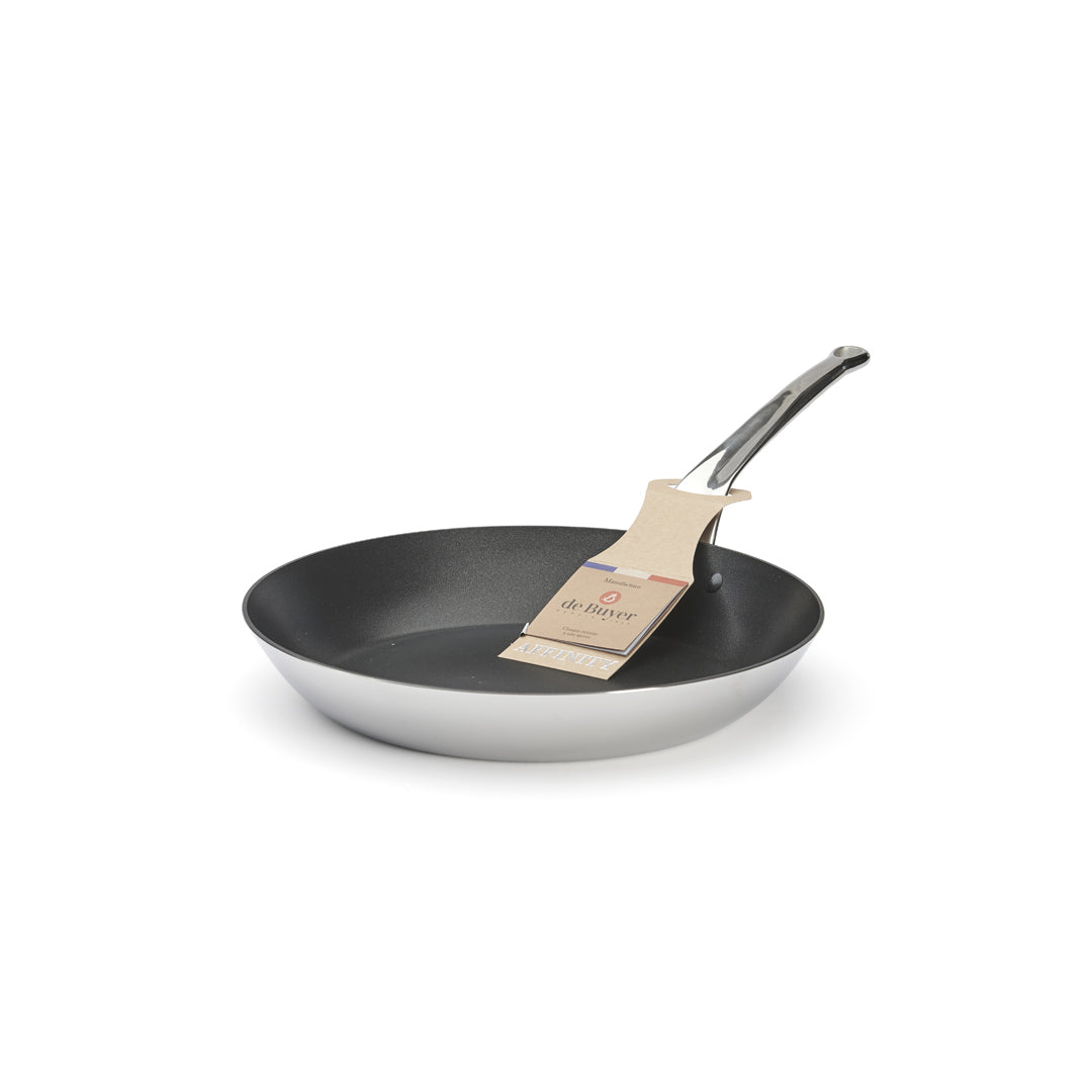 The Affinity non-stick frying pan from de Buyer with a Lyonnaise profile skirt enables you to easily slide food onto a dish. Ideal for cooking delicate food, slow cooking and heating and warming food. The material is ultra reactive and let's you control the cooking process. The frying pan has a high quality resistant non-stick coating, guaranteed PFOA-free. The long, elegant, ergonomic cast stainless steel handle, firmly fastened with rivets, guarantees a natural and comfortable grip.
