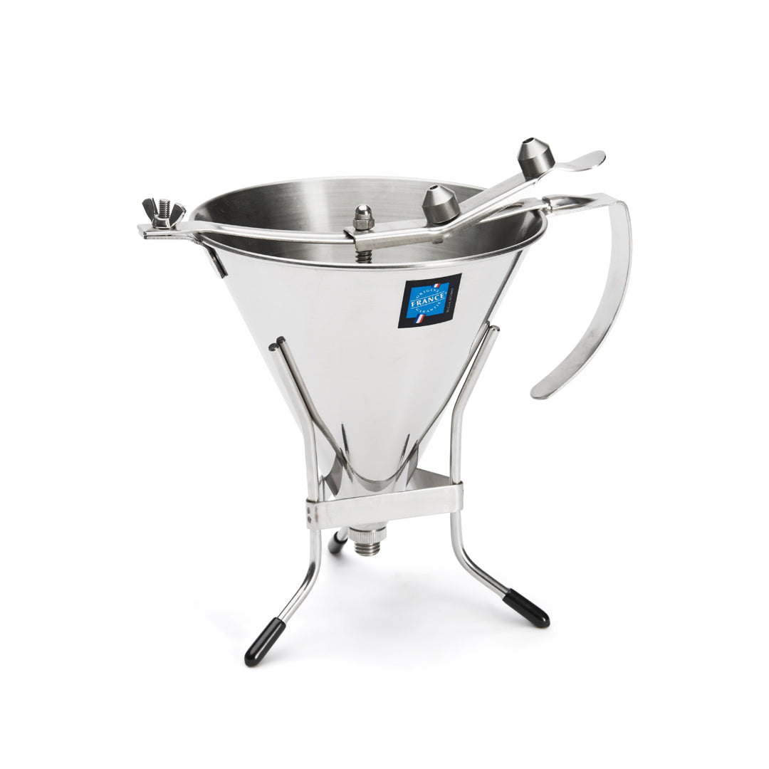 A De Buyer 1.5L automatic piston funnel with stand is a kitchen tool designed for efficient and precise pouring. It features a 1.5-liter capacity and an automatic piston mechanism that controls the flow of liquids. The accompanying stand ensures stability during use, making it ideal for tasks such as baking and cooking.